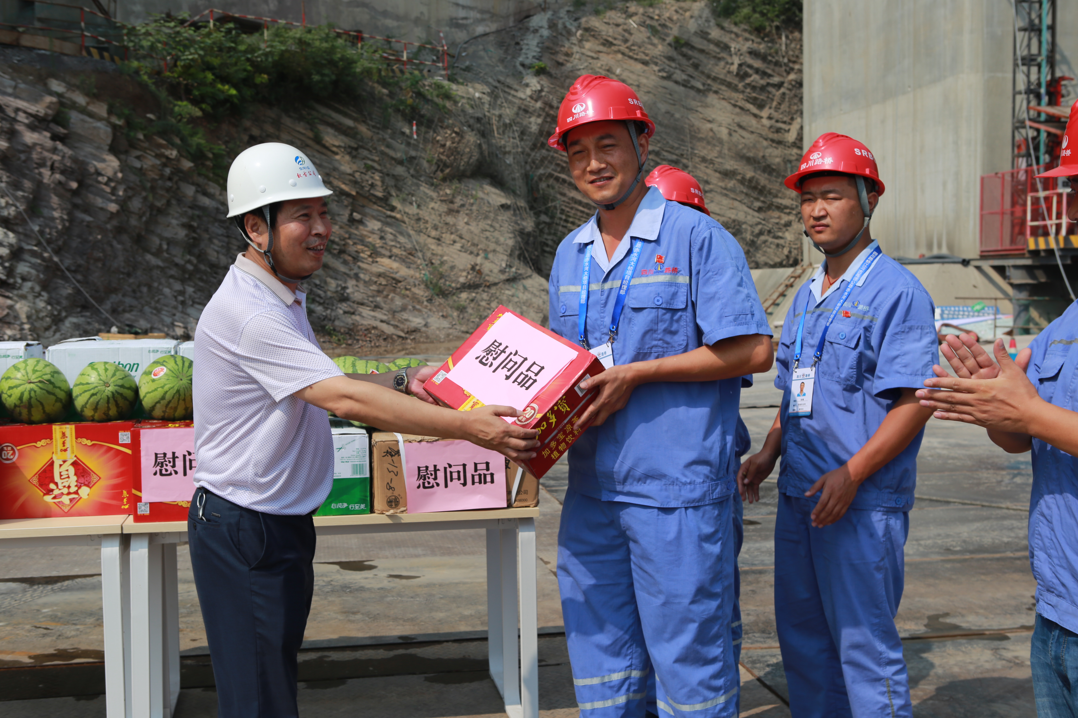 慰問(wèn)中,劉小波總經(jīng)理和李興明主席分別代表公司和公司工會(huì)向一線(xiàn)員工表示親切的慰問(wèn)和崇高的敬意,為他們送上礦泉水、飲料、西瓜、藿香正氣液防暑降溫用品,送去黨政的關(guān)懷、關(guān)愛(ài)。同時(shí)叮囑站上和項(xiàng)目負(fù)責(zé)人,一定要做好職工勞動(dòng)保護(hù)措施,加強(qiáng)勞動(dòng)安全監(jiān)管,合理安排作業(yè)時(shí)間,錯(cuò)開(kāi)高溫時(shí)段,切實(shí)保障職工生命健康安全。在赤水河大橋施工現(xiàn)場(chǎng),李興明主席指出,目前赤水河大橋已完成先導(dǎo)索穿引架設(shè),標(biāo)志著大橋正式轉(zhuǎn)入上部構(gòu)造高空施工作業(yè)階段,要在保證一線(xiàn)員工生命安全、確保工程質(zhì)量的前提下,高質(zhì)量、安全地完成大橋建設(shè)的每個(gè)環(huán)節(jié)和流程,爭(zhēng)取早日實(shí)現(xiàn)大橋建成通車(chē)。