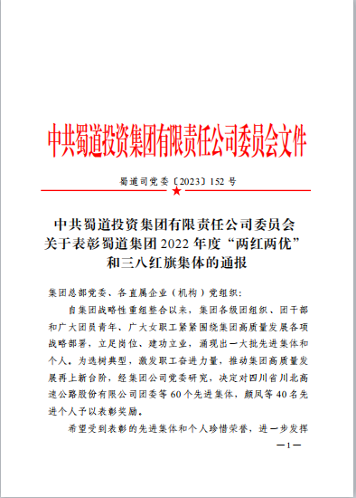 為選樹典型,激發(fā)職工奮進(jìn)力量,推動(dòng)蜀道集團(tuán)高質(zhì)量發(fā)展再上新臺(tái)階,4月17日,蜀道集團(tuán)黨委印發(fā)《關(guān)于表彰蜀道集團(tuán)2022年度“兩紅兩優(yōu)”和三八紅旗集體的通報(bào)》,敘古公司機(jī)關(guān)團(tuán)支部榮獲榮獲五四紅旗團(tuán)支部稱號(hào)。