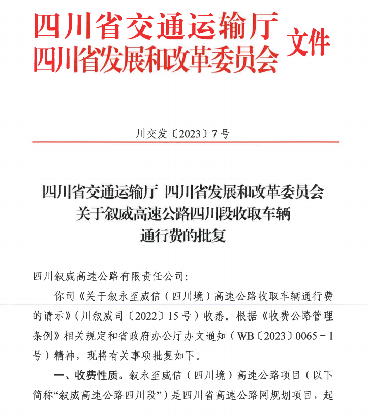 敘永至威信(四川境)高速公路(以下簡稱“敘威高速公路”)是四川省高速公路網規(guī)劃項目,起于瀘州市敘永縣境內,與納黔公路相接,經長秧、枧槽、長壩、分水,止于下河,對接云南宜畢高速公路敘永支線,路線全長35.335公里,雙向四車道,于2018年6月開工建設,2021年7月1日建成通車。經四川省人民政府同意,根據(jù)四川省交通運輸廳 四川省發(fā)展和改革委員會《關于敘威高速公路四川段收取車輛通行費的批復》(川交發(fā)〔2023〕7號)精神,批準敘威高速公路于2023年3月17日零時正式聯(lián)網收取車輛通行費,現(xiàn)公告如下: