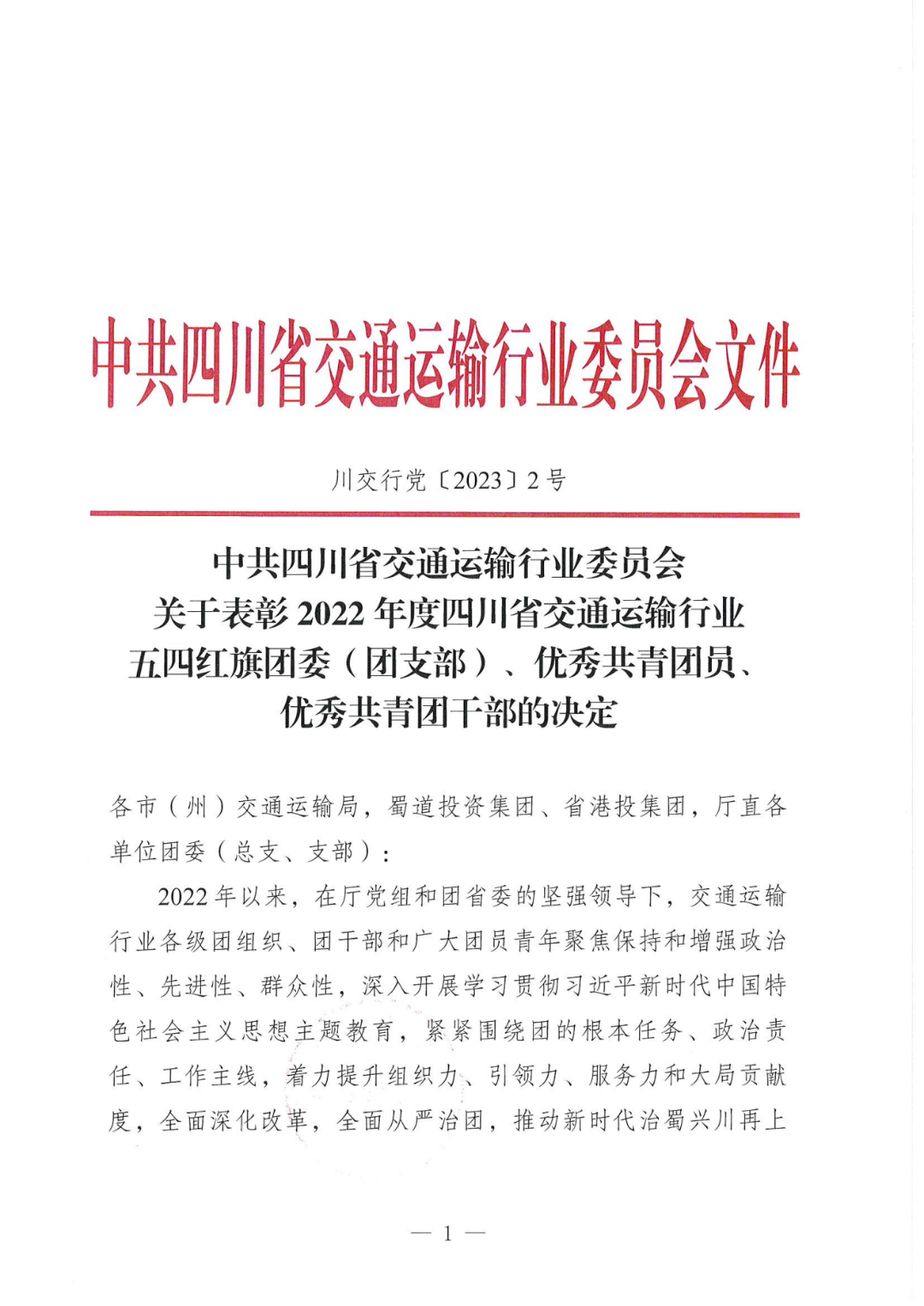 為表彰先進(jìn)、樹(shù)立典型,近日,四川省交通運(yùn)輸行業(yè)黨委發(fā)布了關(guān)于表彰2022年度四川省交通運(yùn)輸行業(yè)五四紅旗團(tuán)委(團(tuán)支部)、優(yōu)秀共青團(tuán)員、優(yōu)秀共青團(tuán)干部的決定,敘古公司團(tuán)委書(shū)記、黨務(wù)工作部(人力資源部)副部長(zhǎng)李青榮獲優(yōu)秀共青團(tuán)干部榮譽(yù)稱號(hào)。