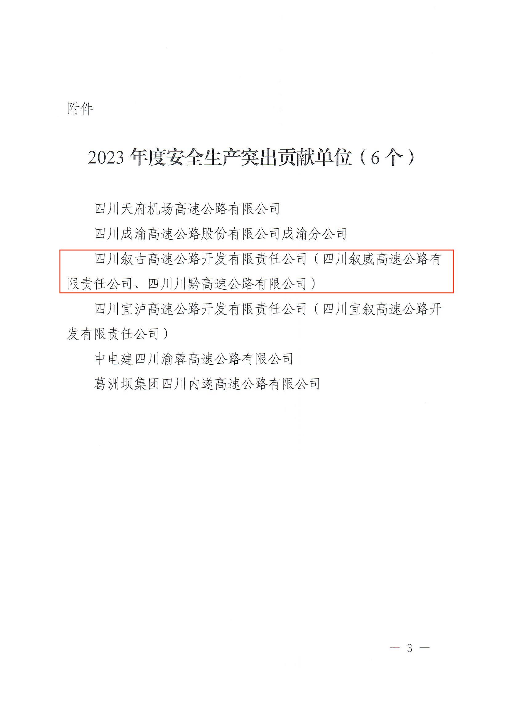為表?yè)P(yáng)先進(jìn)、樹(shù)立典型,近日,四川省交通運(yùn)輸綜合行政執(zhí)法總隊(duì)第一支隊(duì)對(duì)轄區(qū)安全生產(chǎn)工作成效顯著、貢獻(xiàn)突出的單位進(jìn)行通報(bào),敘古敘威川黔公司榮獲“2023年度安全生產(chǎn)突出貢獻(xiàn)單位”表彰。