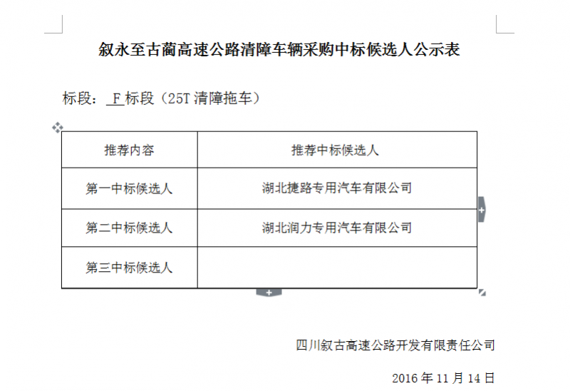 敘永至古藺高速公路清障車輛(F標(biāo)段)采購中標(biāo)候選人公示表